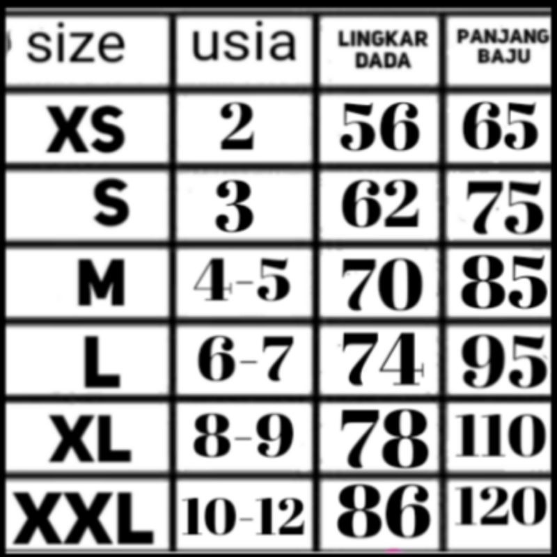 Produk ini memiliki 6 Variasi Ukuran yaitu : Xs=2 thn,S=3 thn,M=4-5 thn,L=6-7 thn,Xl=8-9 thn,Xxl=10-12 thn,